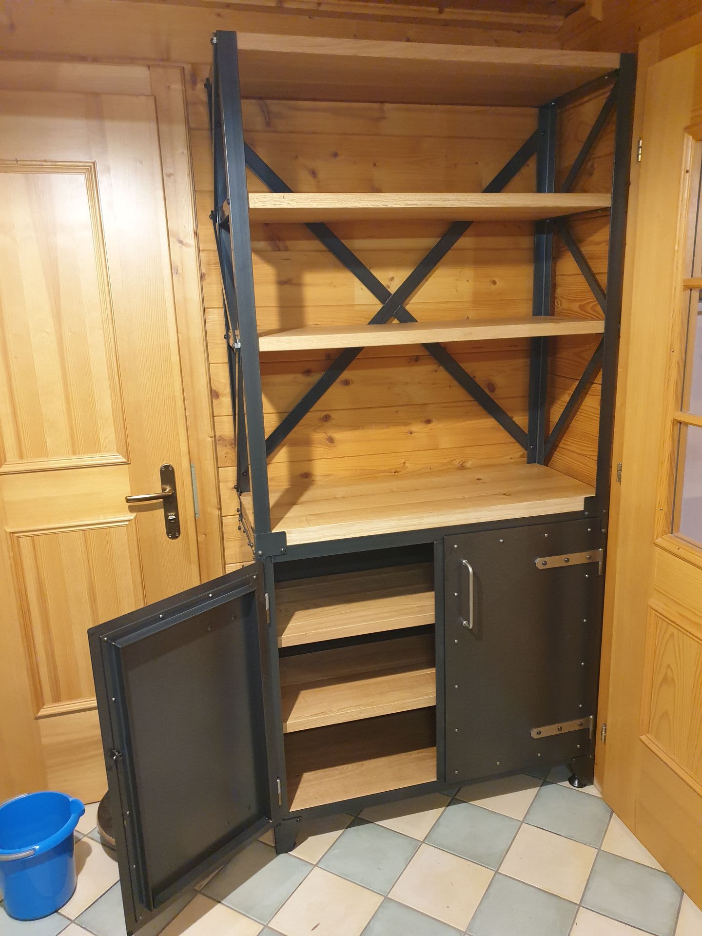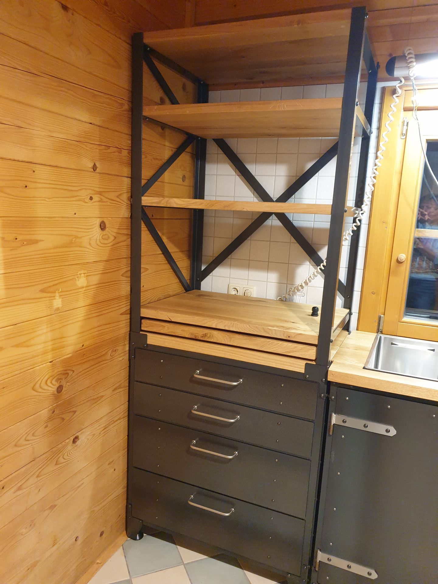 Die warmgewalzten, verzunderten Stahl-Rahmenprofile und Stahlbleche bei den Tür- und Schubladenfronten sind transparent pulverbeschichtet, wodurch sich der natürliche Charakter des Stahls besonsders hervorhebt und zusätzlich ist der Stahl perfekt geschützt und leicht zu reinigen.
