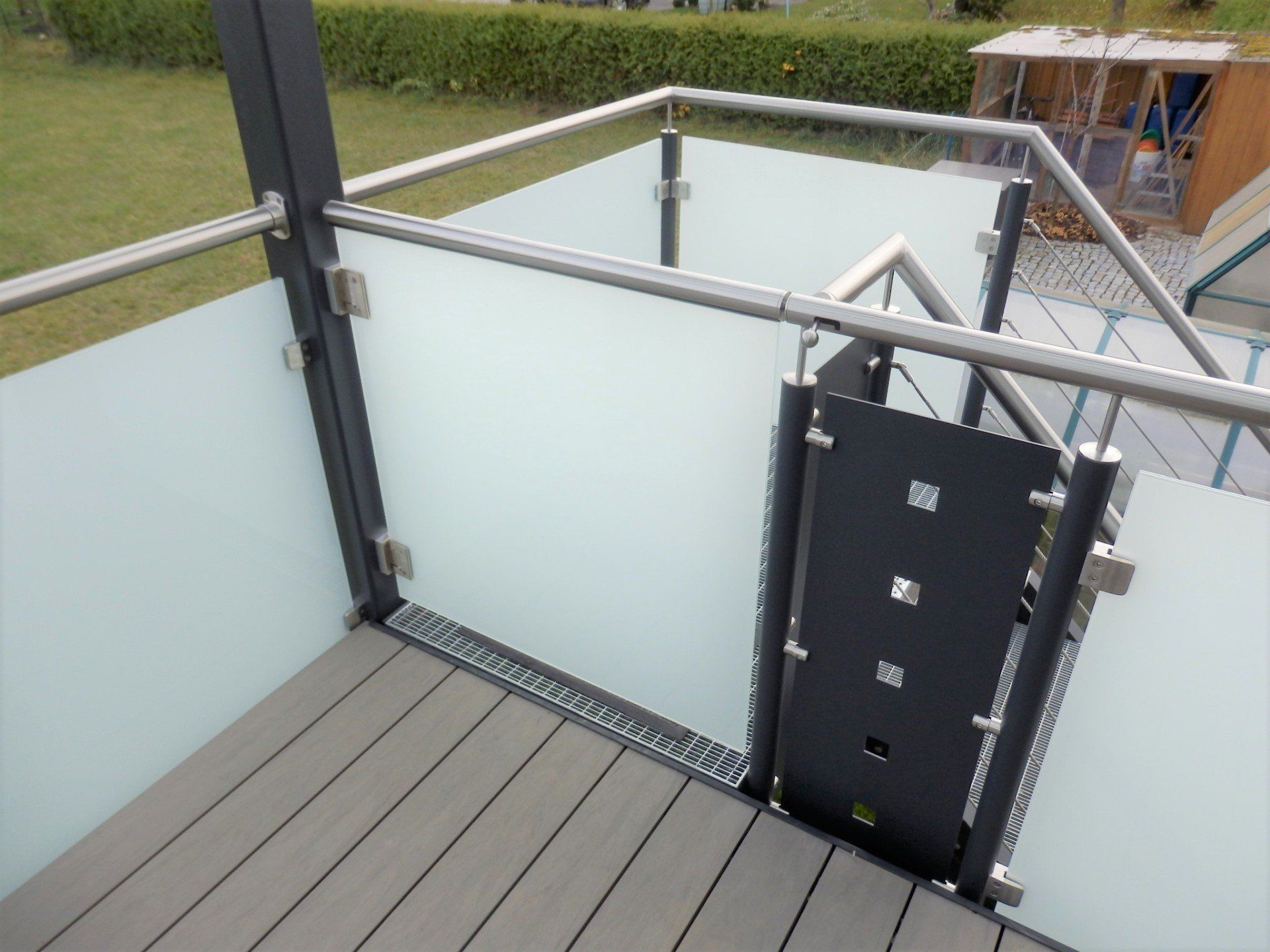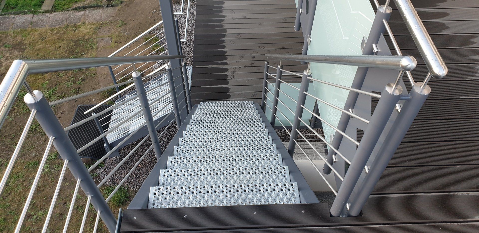 Die Stahlkonstruktion sowie auch die Geländerrahmen sind komplett feuerverzinkt und in Anthrazit RAL 7016 pulverbeschichtet.