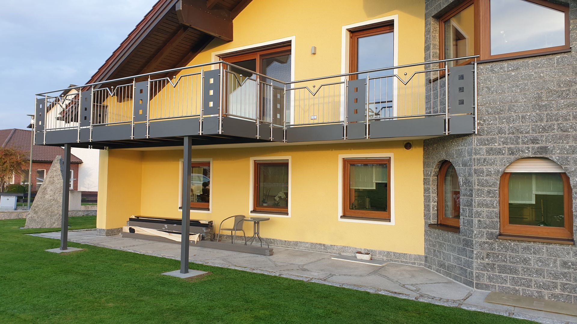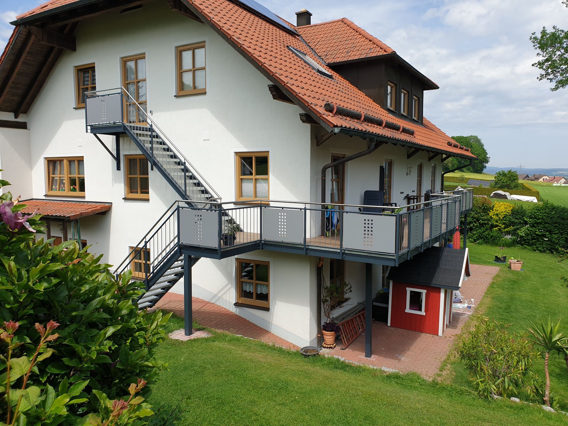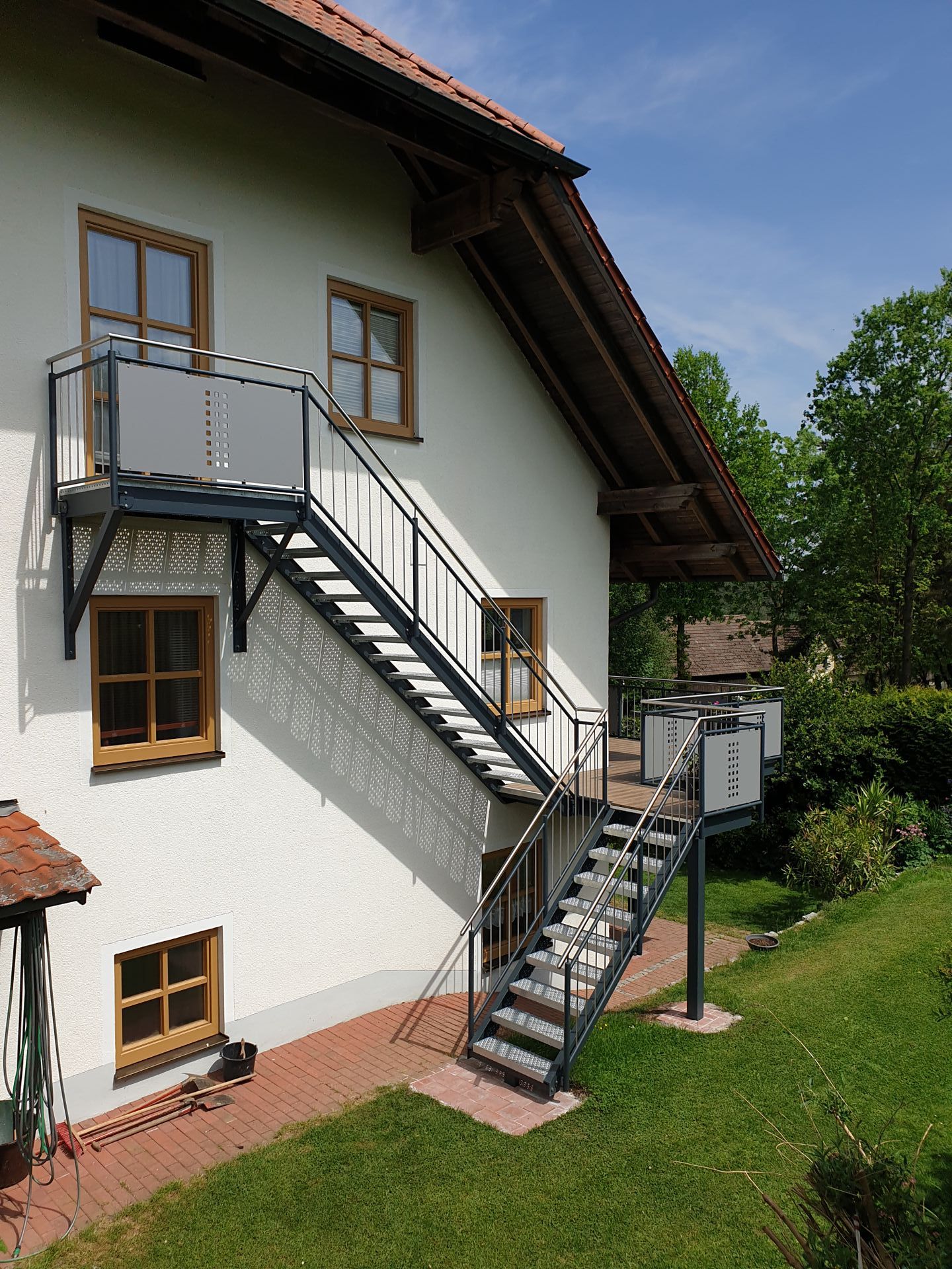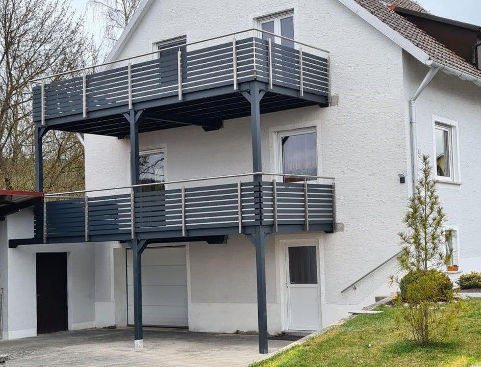 Balkonkonstruktion über zwei Stockwerke mit Treppe, Überdachung, Geländer und
