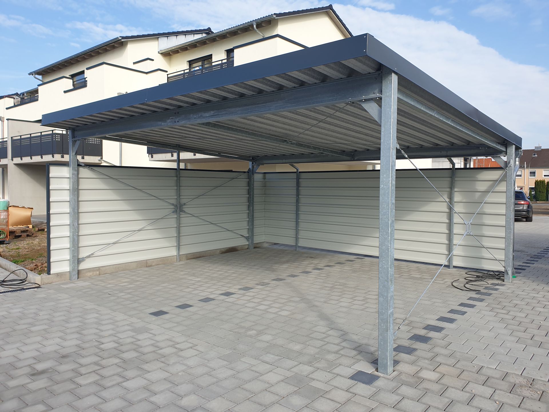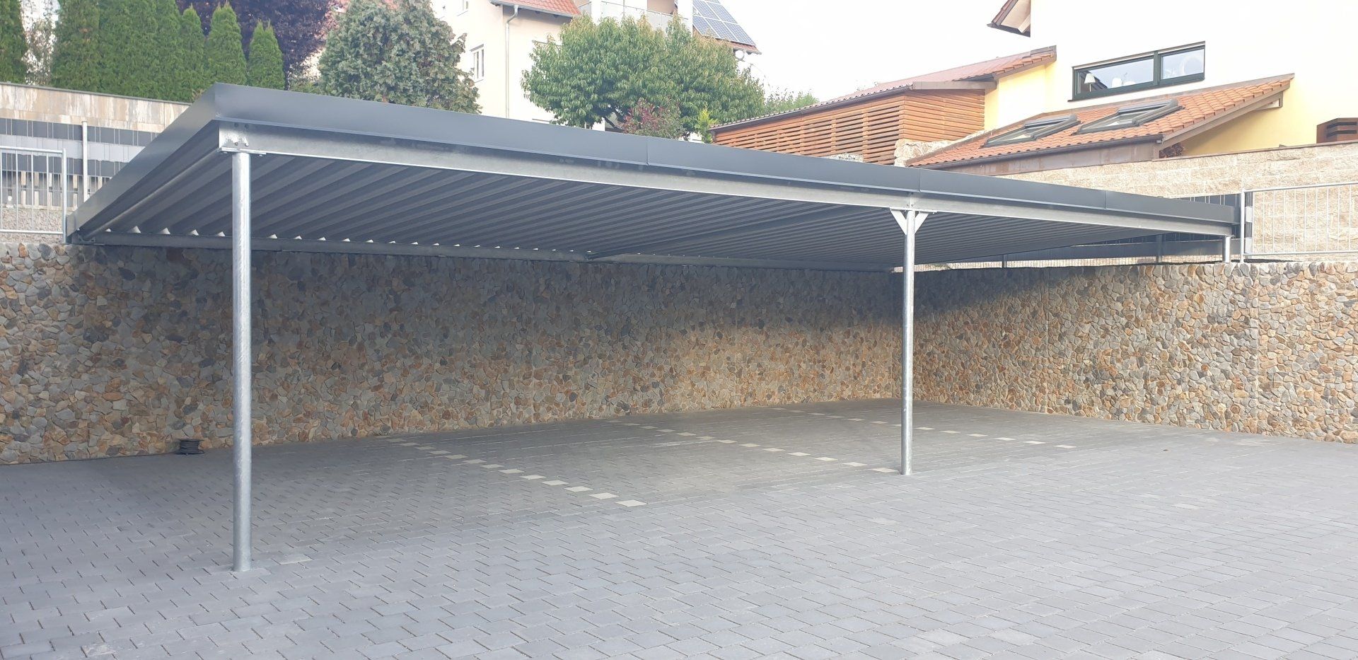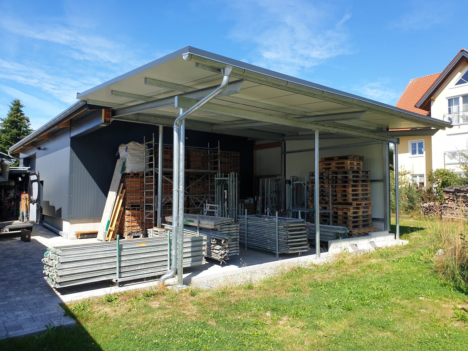 Das Überdachungsmaterial kann je nach Bedarf aus Glas, Trapezblech oder mit Dachbegrünung sein.