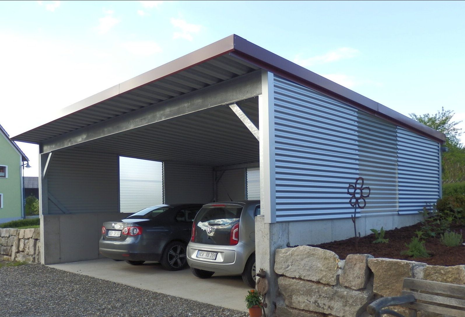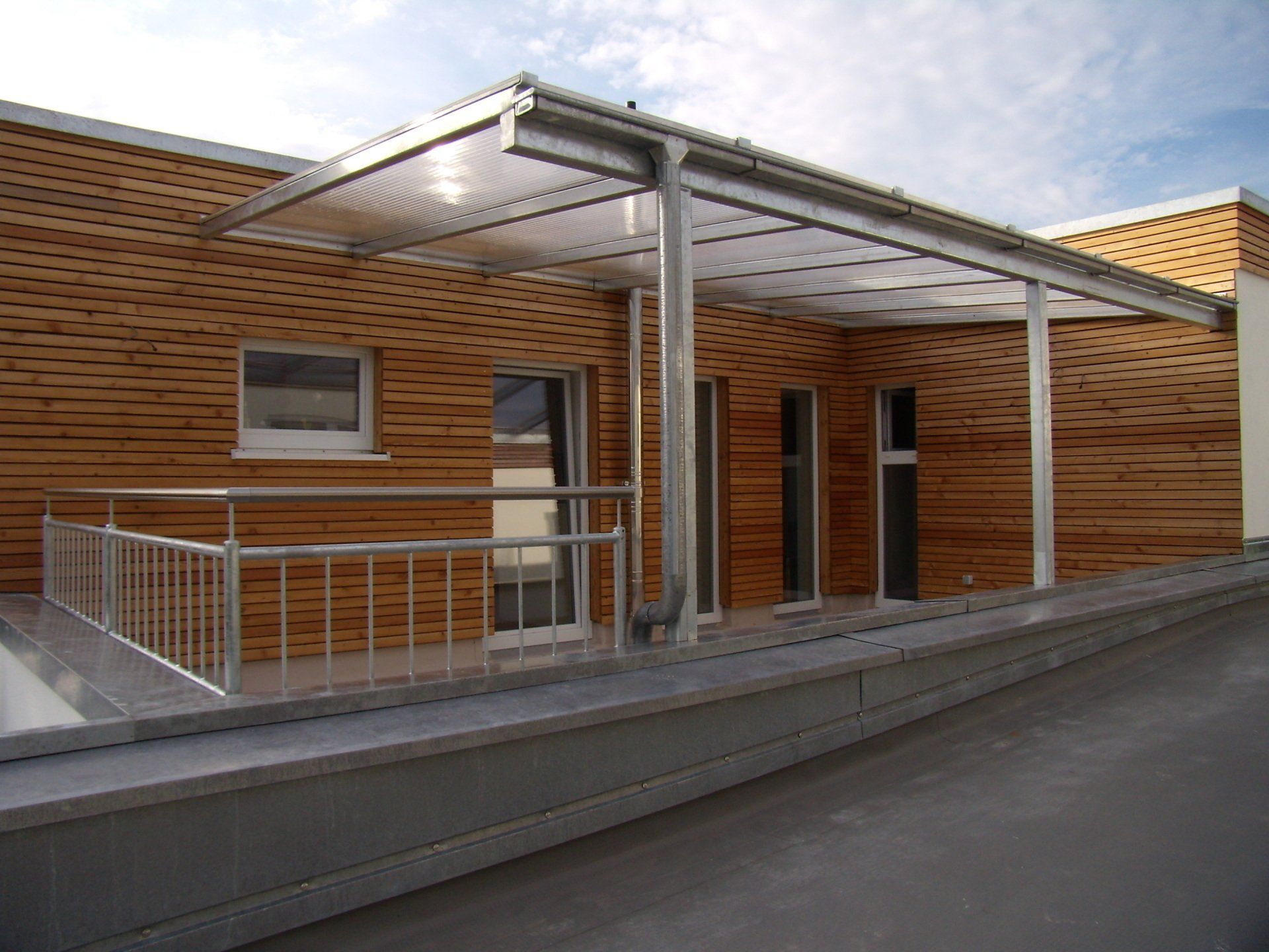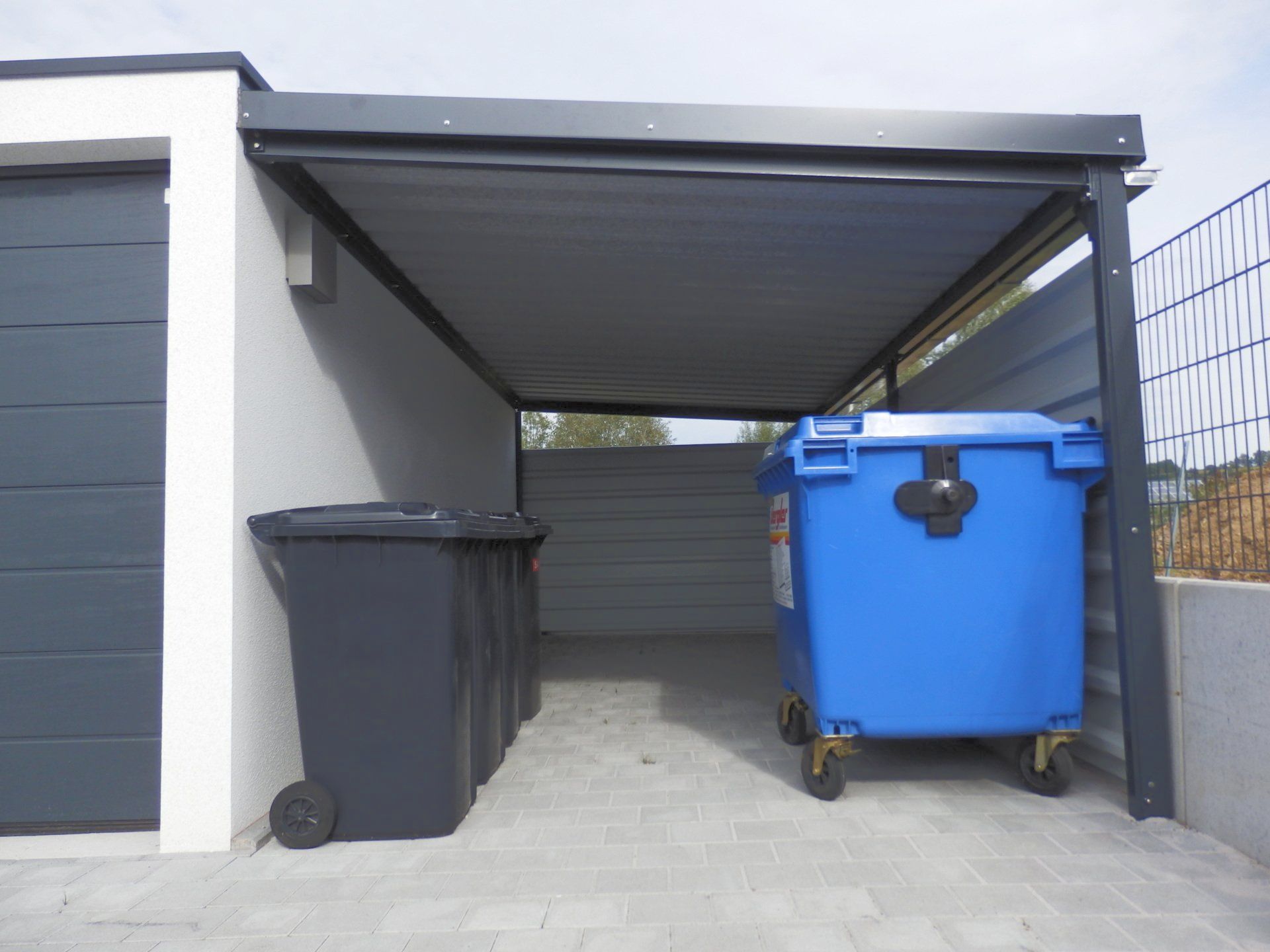 Das Überdachungsmaterial kann je nach Bedarf aus Glas, Trapezblech oder mit Dachbegrünung sein.